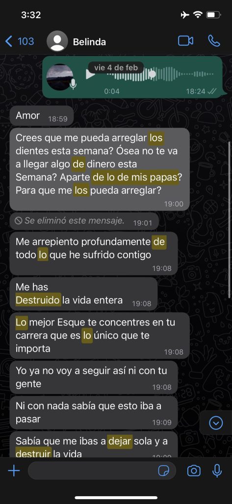 «Amor, ¿crees que me pueda arreglar los dientes esta semana, o sea, no te va a llegar algo de dinero esta semana, aparte de lo de mis papás, para que me los pueda arreglar?» escribió vía Whatsapp la cantante y actriz de «Bienvenidos a Edén», lo que fue publicado por su expareja.