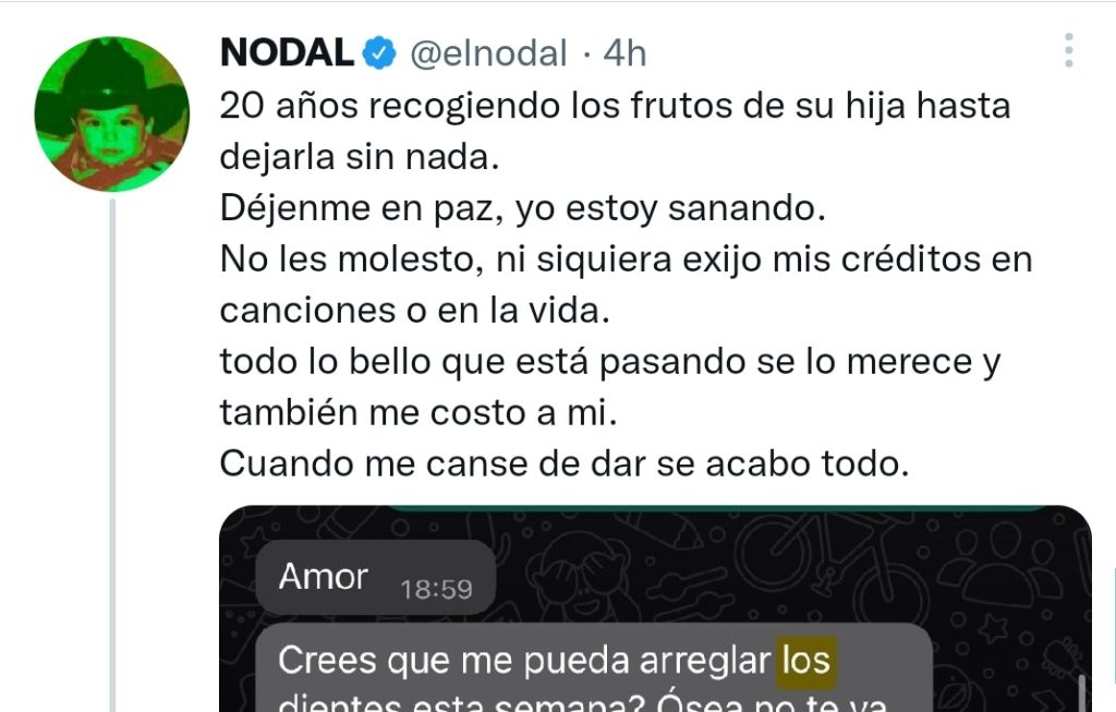 A través de una publicación de Twitter, Nodal compartió una captura de pantalla en la que se lee a Belinda preguntándole si no le va a llegar algo de dinero, además de lo de sus papás para arreglarse los dientes.