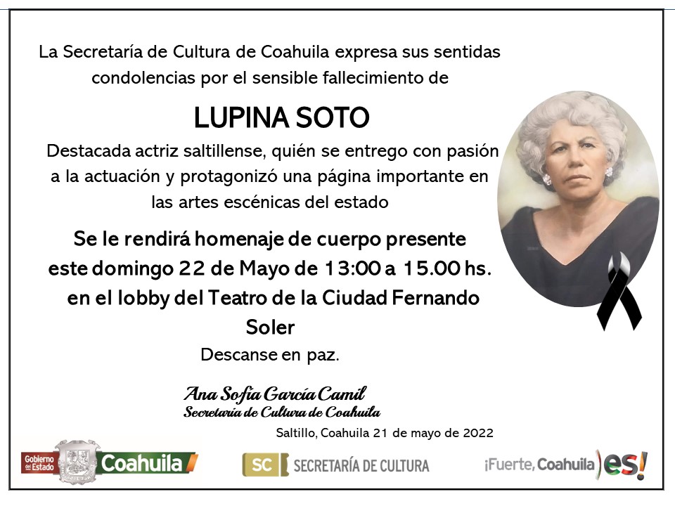 La Secretaría de Cultura de Coahuila lamento desde temprana hora el deceso de la reconocida actriz saltillense María Guadalupe Treviño Morales, mejor conocida en el ambiente artístico como “Lupina Soto”.
