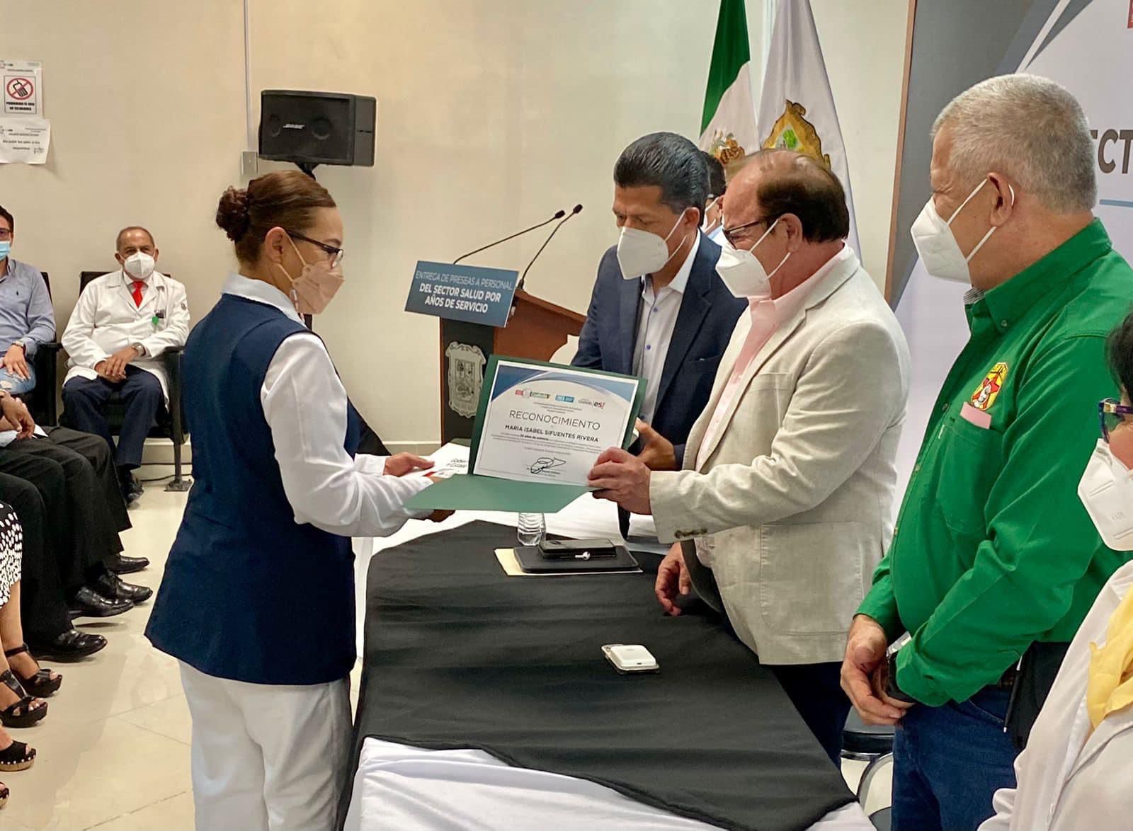 “Entregamos este día preseas por 20, 25, 30, 35 y 50 años de servicios a médicos, personal de enfermería y de apoyo, así como a trabajadores administrativos de unidades de salud que pertenecen a los municipios de Torreón, Matamoros, San Pedro y Francisco I. Madero”, explicó Bernal Gómez.