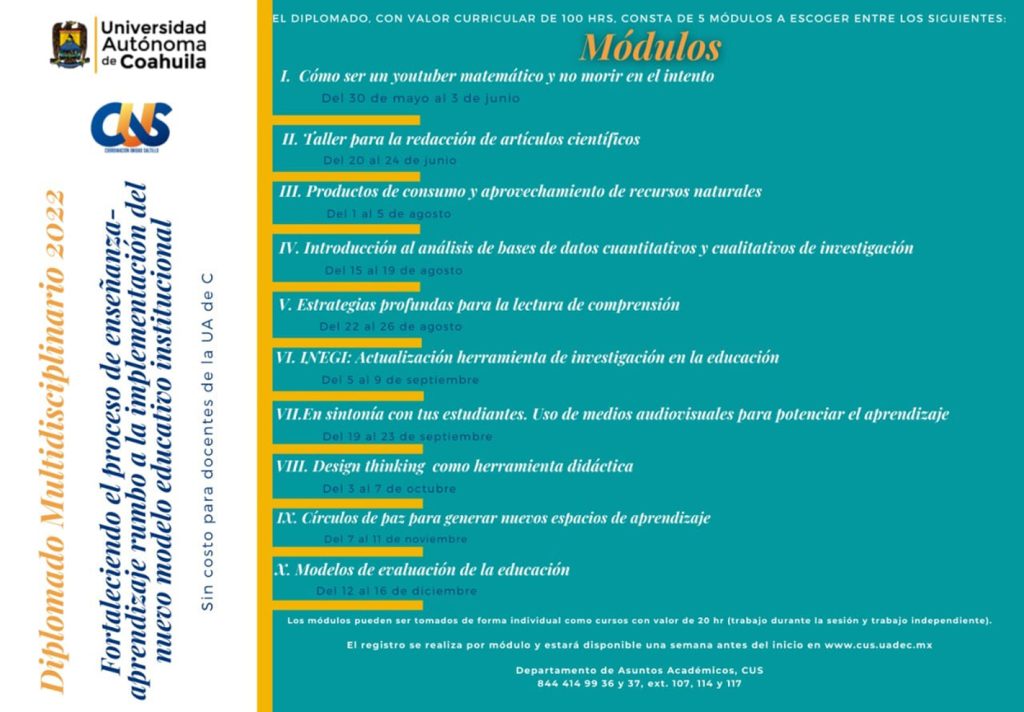 El Departamento de Asuntos Académicos de la Coordinación de Unidad Saltillo, de la Universidad Autónoma de Coahuila, invita a los docentes de la Universidad Autónoma de Coahuila a formar parte del Diplomado Multidisciplinario 2022 “Fortaleciendo el proceso de enseñanza-aprendizaje rumbo a la implementación del Nuevo Modelo Educativo Institucional”.