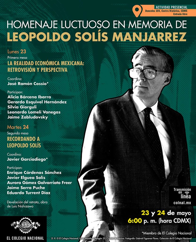Este martes continúa con la Segunda Mesa, “Recordando a Leopoldo Solís”, coordina el colegiado Javier Garciadiego, especialistas dialogarán sobre su vida y obra; entre ellos, Enrique Cárdenas Sánchez, investigador de la Universidad Iberoamericana; Javier Elguea Solís, rector del Instituto Tecnológico de Teléfonos de México; Aurora Gómez Galvarriato Freer, historiadora económica y social de El Colegio de México; Jaime Serra Puche, presidente del Grupo Financiero BBVA; y Eduardo Turrent Díaz, autor de la obra Historia del Banco de México (1982).