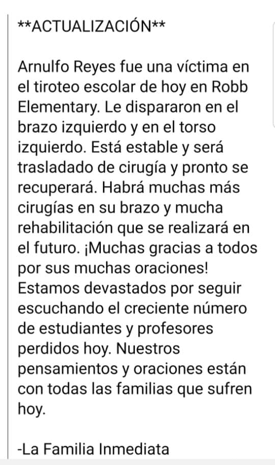 “Arnulfo Reyes fue una víctima en el tiroteo escolar de hoy en Robb Elementary. Le dispararon en el brazo izquierdo y en el torso izquierdo. Está estable y será trasladado de cirugía y pronto se recuperará”, dio a conocer Memo Corona, primo del afectado en su cuenta personal de Facebook.