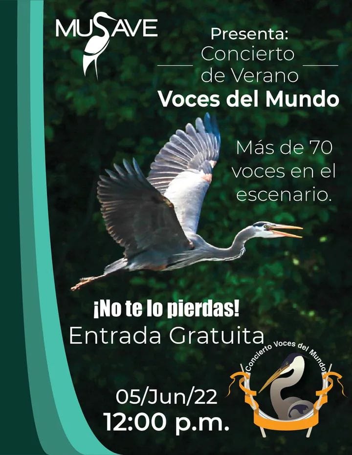 Este domingo 5 de junio se llevará a cabo en el Museo de las Aves de México (MUSAVE) el concierto de verano «Voces del Mundo», en el cual tomarán parte más de 70 voces en el escenario, y se interpretarán piezas musicales de distintos países del mundo.