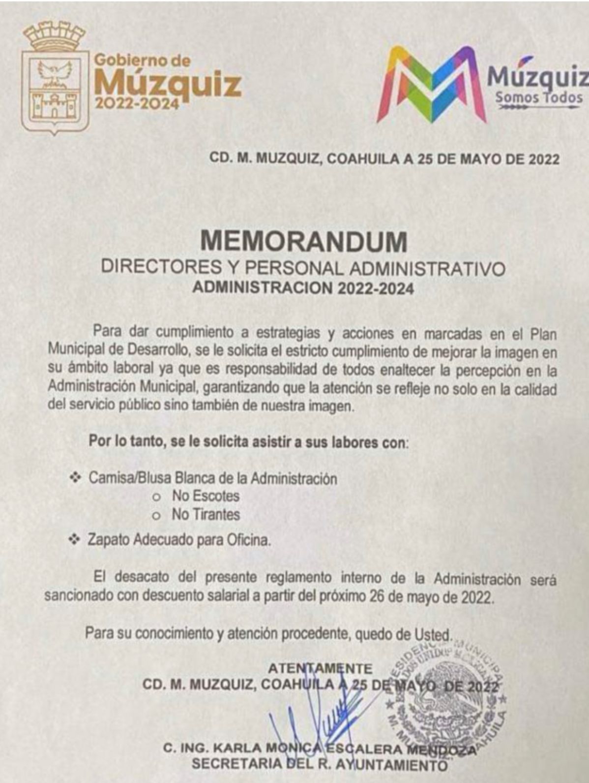 La alcaldesa del municipio de Múzquiz, Coahuila, emanada de las filas de Morena, Tania Flores, ordenó que las mujeres que laboran en el ayuntamiento asistan a sus labores con blusa blanca, pero les prohibió los escotes y los tirantes, porque de lo se les hará un descuento en su salario.