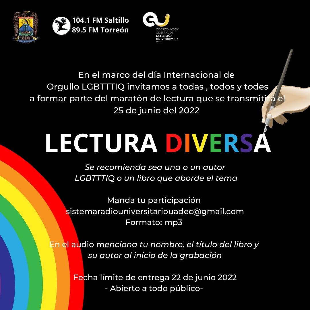 Para unirse a la celebración del Mes del Orgullo LBTTTIQ, la Universidad Autónoma de Coahuila a través del Sistema Universitario de Radio y la Coordinación general de Extensión Universitaria, llevará a cabo el Primer Maratón de Lectura Diversa que se transmitirá el 25 de junio del presente, en señal libre a través de las estaciones del Sistema de Radio Universitario en Saltillo 104.1 FM, en Torreón 89.5 FM y en línea en www.uadec.mx/radio