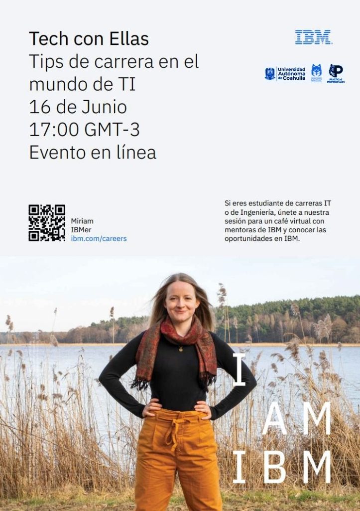 La Universidad Autónoma de Coahuila a través de la Coordinación General de Vinculación e Innovación Productiva y el Departamento de Prácticas Profesionales, convocan a estudiantes y graduadas de carreras de tecnología de la información e ingeniería a participar en el evento “Tech con Ellas” de International Business Machines Corporation IBM, que se llevará a cabo de manera virtual el 16 de junio de 2022 a las 17:00 horas.