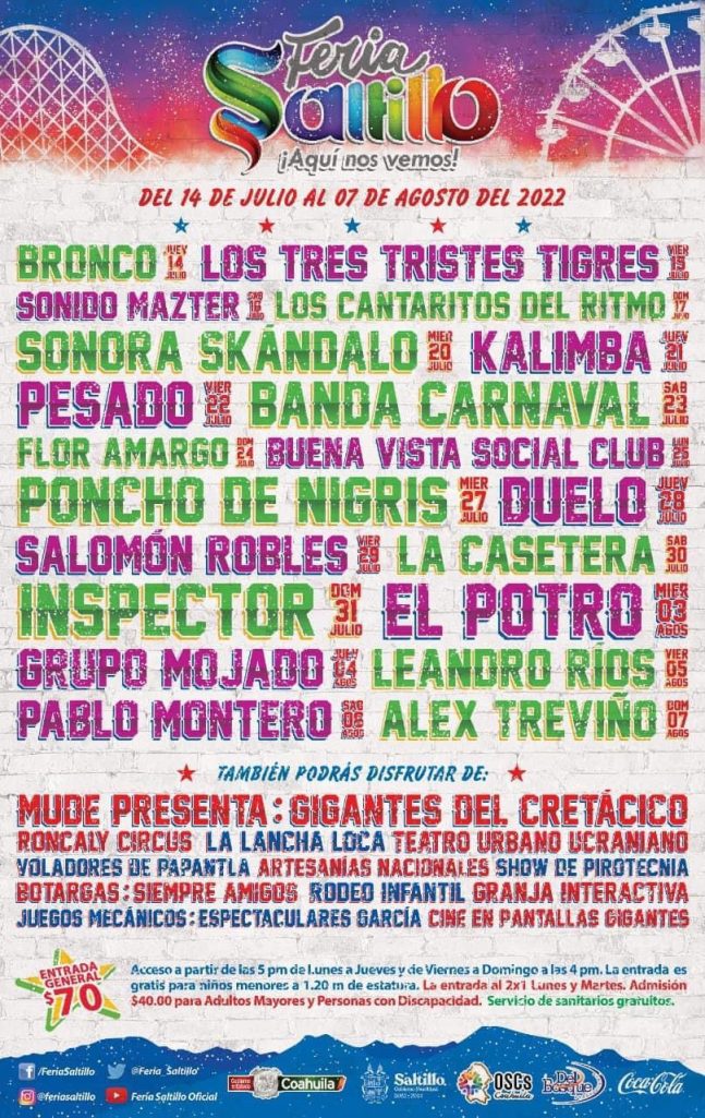 Además, en la presentación se anunció también que destacadas agrupaciones y artistas como Bronco, Pesado, Kalimba, Sonido Mazter, Banda Carnaval, Flor Amargo, Duelo, Salomón Robles, los Tres Tristes Tigres, Leandro Ríos e Inspector, formarán parte del elenco que se presentará en el Teatro del Pueblo de la Feria Saltillo 2022.