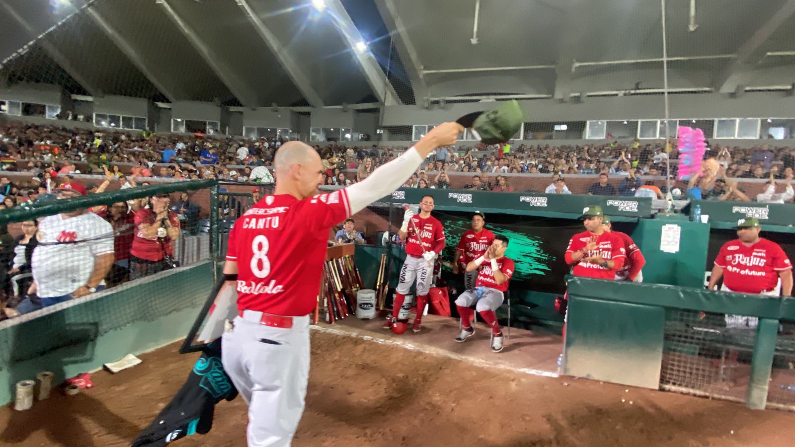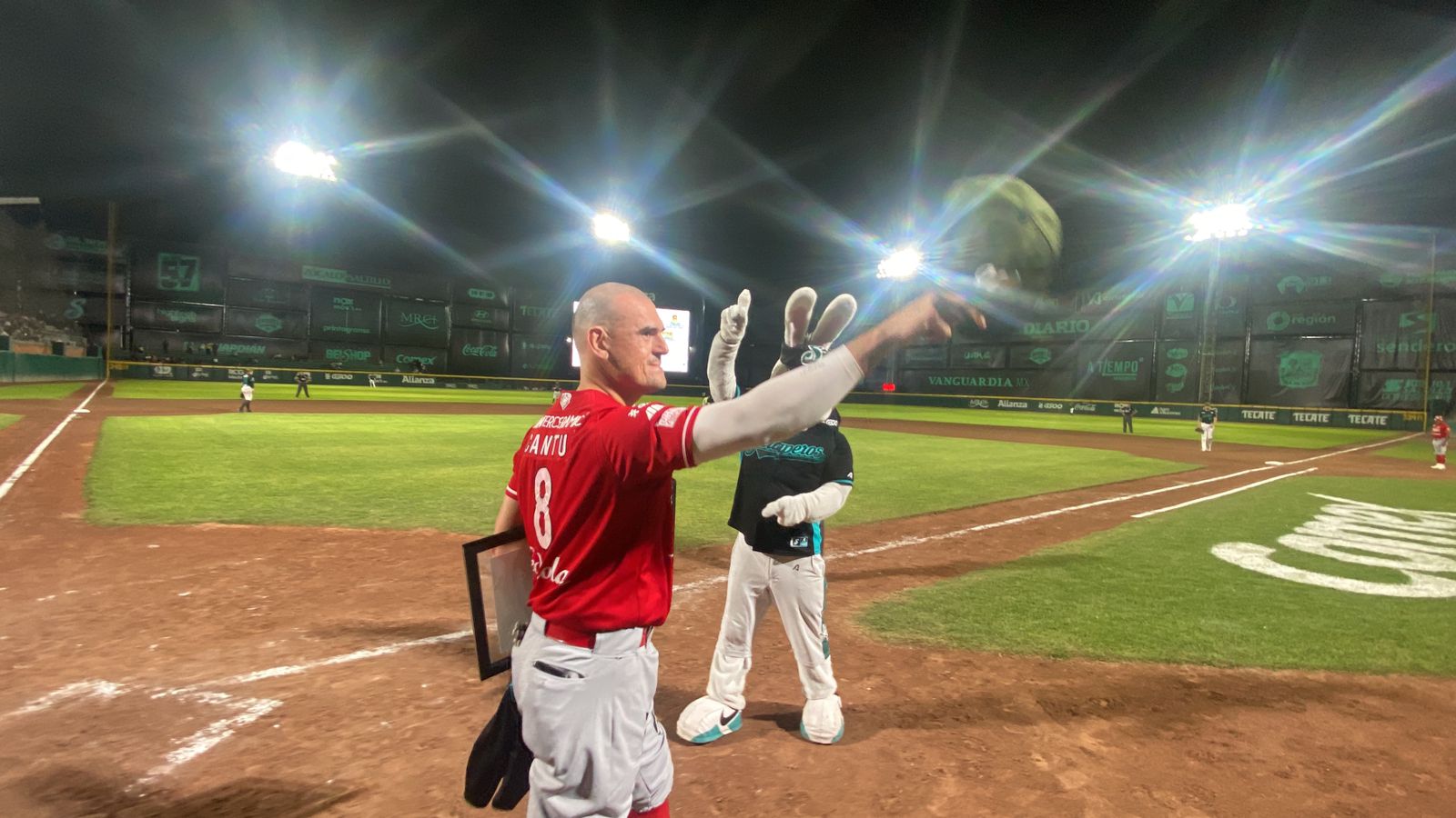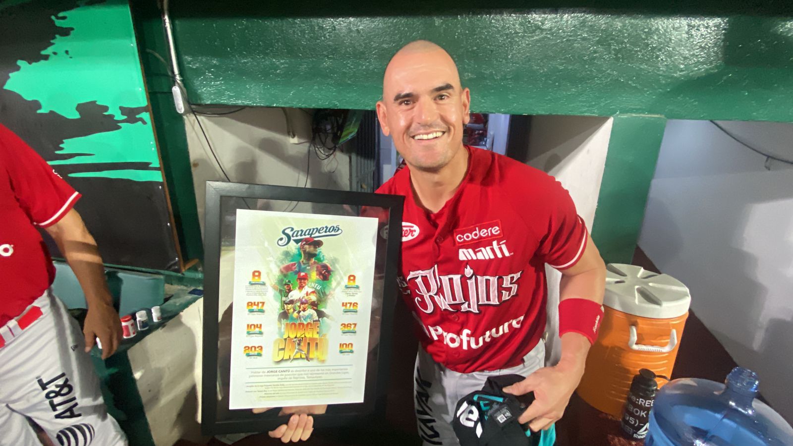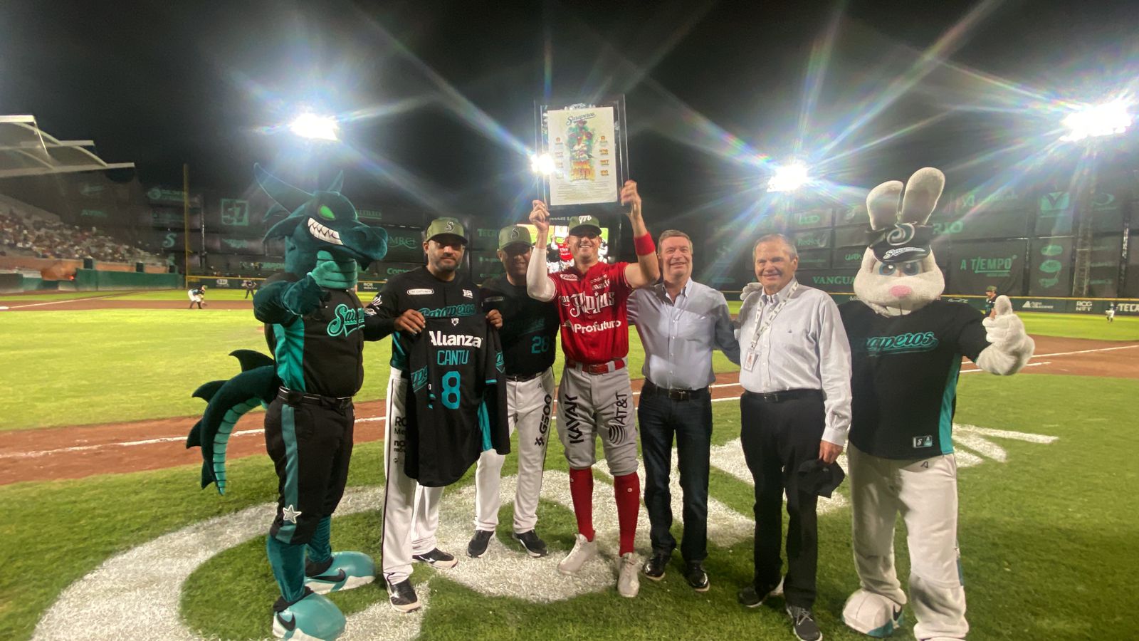 En la quinta entrada del primero de la serie entre Diablos Rojos del México y Saraperos de Saltillo, los Directivos JORGE VERÁSTEGUI E ISRAEL RODRÍGUEZ, acompañado por Adán Muñoz, Manager del Equipo y Noé Muñoz, una de las leyendas del club, entregaron Casaca, Gorra de la novena saltillense y un reconocimiento a JORGE CANTÚ, ante una gran ovación de la mejor afición, que reconoce una brillante carrera.