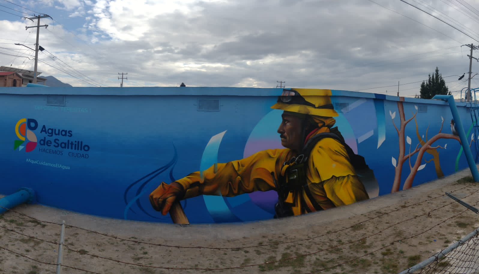 Por ello, AGSAL rindió homenaje a los brigadistas que combaten los incendios forestales en la Sierra de Zapalinamé a través de un mural en el depósito Teresitas 1 ubicado al sur de la ciudad. La imagen plasmada en esta instalación representa a un brigadista con herramienta en mano, además lo acompaña flora y fauna nativa de la Sierra, en alusión al trabajo que realizan contra el fuego para preservar el ecosistema que favorece a la captación de agua.