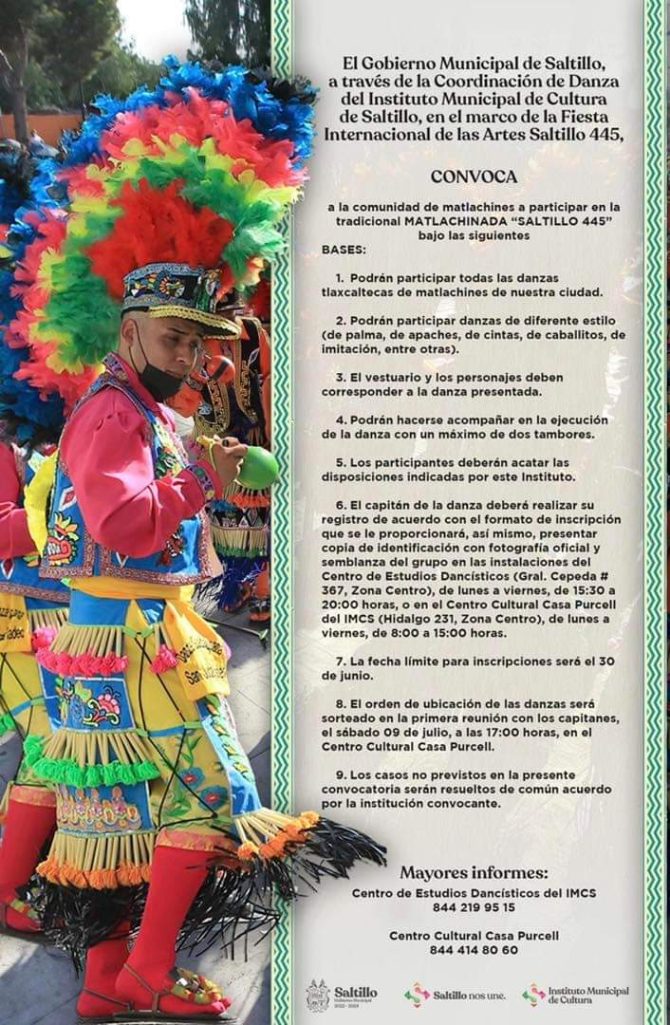 La mañana de este jueves, por medio de sus redes sociales, el Instituto Municipal de Cultura de Saltillo (IMCS) lanzó la convocatoria para que la comunidad de matlachines de la capital coahuilense forme parte de la Matlachinada que se llevará a cabo dentro de la Fiesta Internacional de las Artes Saltillo 445, cuyas fechas de emisión se darán a conocer próximamente.