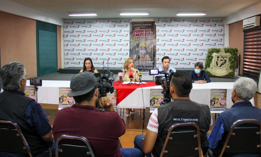 La licenciada Silvia Vázquez Saucedo, secretaria de Fomento Económico del municipio de Ramos Arizpe, encabezó la rueda de prensa para anunciar la “4ta feria del empleo 2022”, acompañada por el presidente de la AIERA el ing. Sergio Aguilar, la coordinadora de Enlace Empresarial, Lorena Gutiérrez y la Coordinadora de bolsa de trabajo Marianela Ramos.