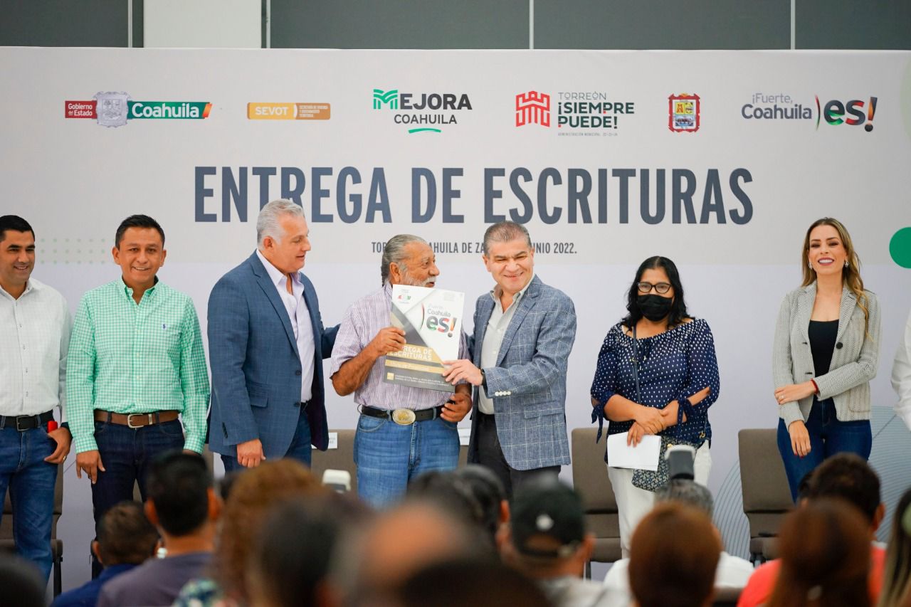 “Estar presente la entrega de más de 200 escrituras, donde a Torreón le corresponden 95, es darles certeza jurídica a los beneficiarios de sus patrimonios”, por lo que agradeció al Mandatario estatal su respaldo.