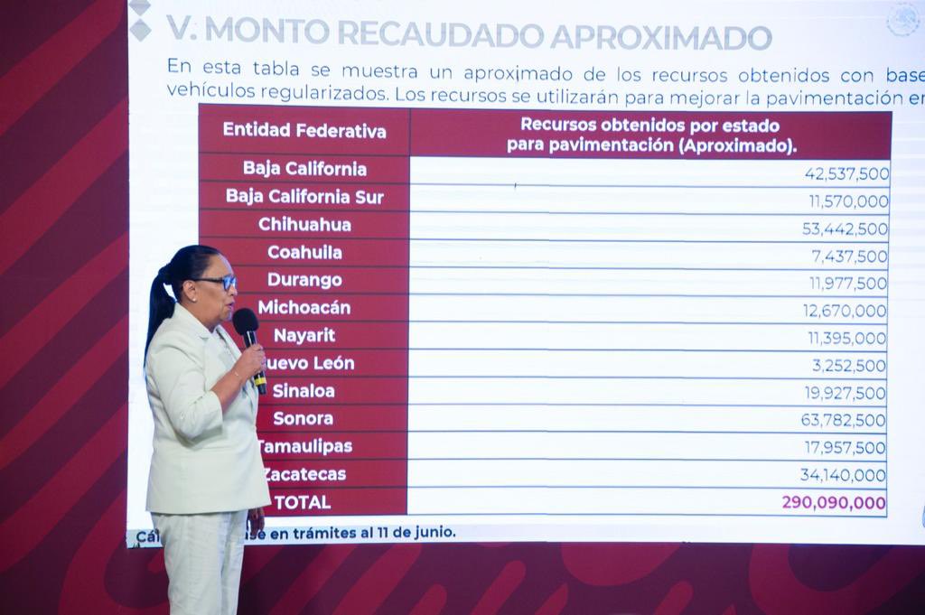 Rosa Icela Rodríguez detalló que hasta la fecha, la entidad donde más vehículos han sido regularizados son Sonora, con 25 mil 513; Chihuahua, con 21 mil 377; Baja California, con 17 mil 015; y Zacatecas, con 13 mil 656.