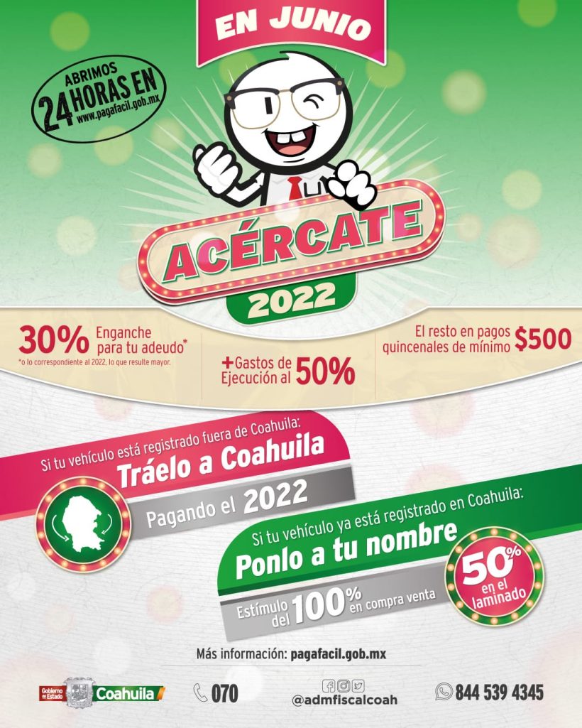 “También está disponible para los contribuyentes que su vehículo esté registrado fuera del Estado, tráelo a Coahuila pagando sólo el Ejercicio Fiscal 2022, se condona al 100 por ciento de ejercicios anteriores”, añadió Díaz González.
