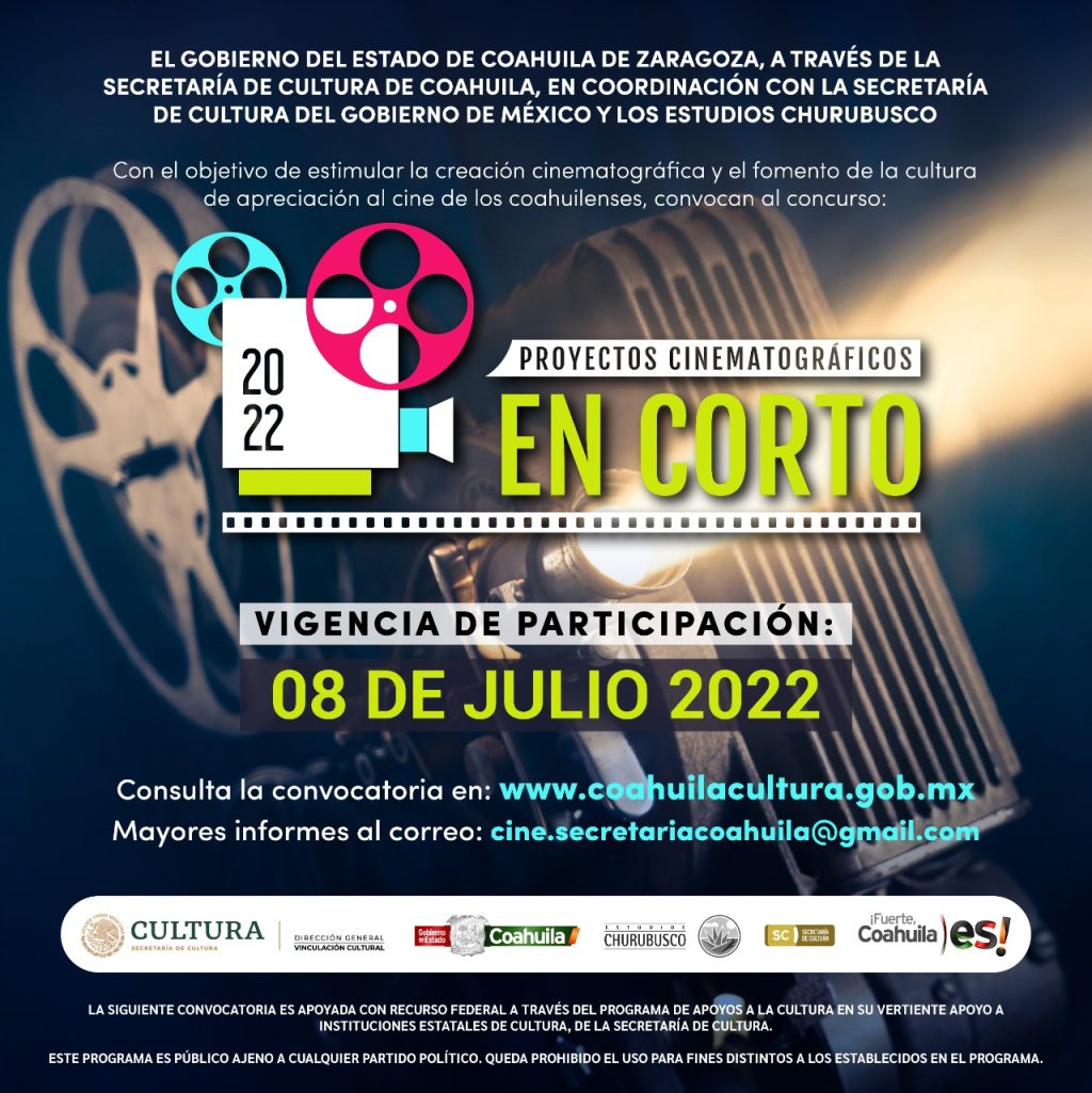 Por otra parte, también se dio a conocer por parte de la funcionaria estatal de la convocatoria PROYECTOS CINEMATOGRÁFICOS EN CORTO, que se realiza en coordinación con la Secretaría de Cultura del Gobierno de México y los Estudios Churubusco, con el objetivo de estimular la creación cinematográfica y el fomento de la cultura de apreciación al cine de los coahuilenses, cierra el próximo 8 de julio del presente año a las 16:00 horas, y tiene los estímulos: Creador/a con Trayectoria. Género Documental.- para directores, productores o directores de fotografía con producción de dos o más largo o cortometrajes de los géneros señalados, y a los que se otorgará un estímulo económico de 100 mil pesos.