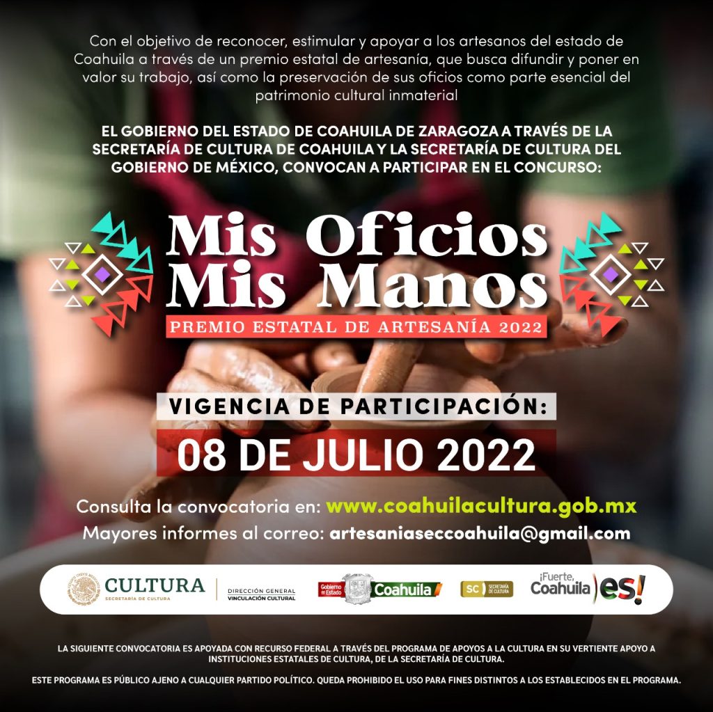 Por último, se recordó que también se encuentra abierta la convocatoria MIS OFICIOS, MIS MANOS: PREMIO ESTATAL DE ARTESANÍA 2022, la cual tiene como objetivo de reconocer, estimular y apoyar a los artesanos del estado de Coahuila a través de un premio estatal de artesanía, que busca difundir y poner en valor su trabajo, así como la preservación de sus oficios como parte esencial del patrimonio cultural inmaterial, la misma cierra el viernes 8 de julio del presente año a las 16:00 horas.