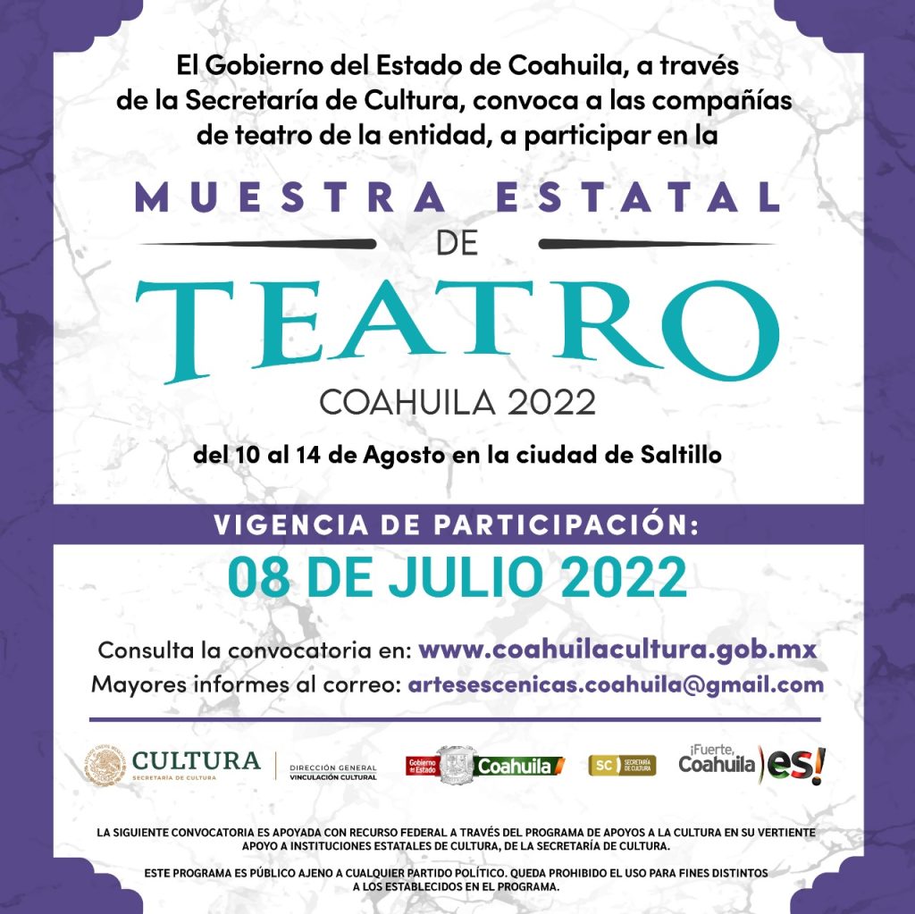 La Secretaria de Cultura, Ana Sofía García Camil, comentó que “en el caso de la Muestra Estatal de Teatro, la convocatoria tiene por objeto seguir impulsando el desarrollo teatral en Coahuila, además de permitir que se empiece fomentar el ambiente teatral con miras a la Muestra Nacional de Teatro, que se realizará del 10 al 19 de noviembre de este año en la Ciudad de Torreón, con la presencia en Coahuila de las mejores compañías nacionales, directores, iluminadores, vestuaristas y todos aquellos que participan en el teatro en México”.