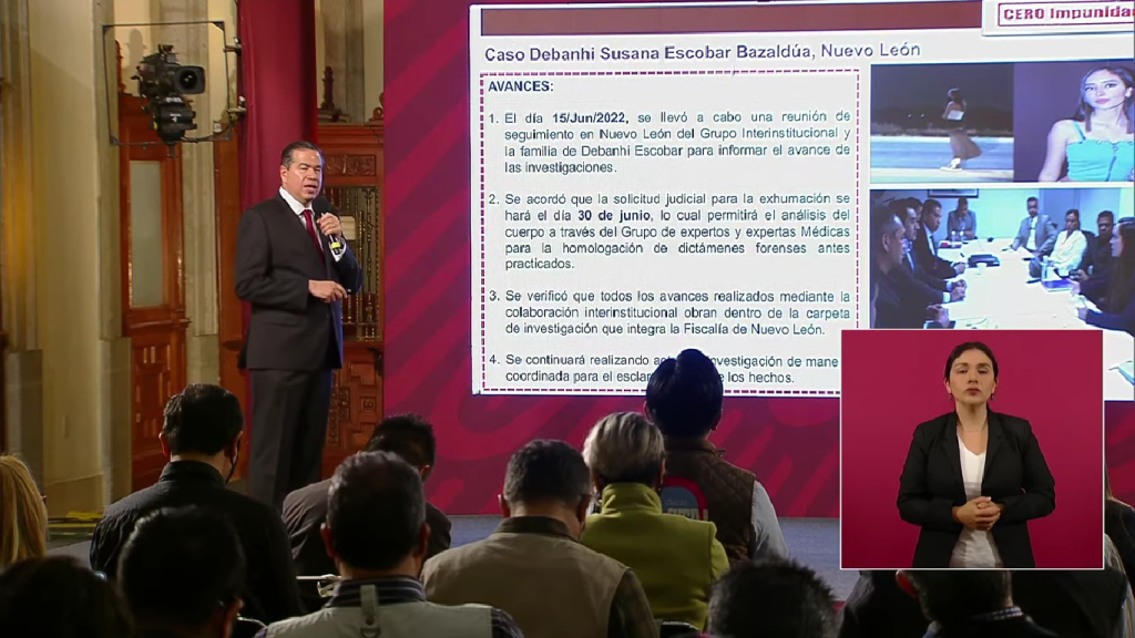 “En actualización del doloroso caso de Debanhi Susana Escobar Bazaldúa, acontecido en Escobedo, Nuevo León, informamos que el día de ayer, tuvimos una reunión por instrucciones del presidente de la República con el fiscal general de Justicia del Estado de Nuevo León, el gobierno de Nuevo León, la Comisión Ejecutiva de Atención a Víctimas (CEAV), y los padres de Debanhi, don Mario Escobar, y doña Dolores Bazaldúa donde se acordó que la solicitud judicial para la exhumación del cuerpo de Debanhi se realice el día 30 de junio, lo cual permitirá el análisis del cuerpo a través de expertos y expertas médicas para la homologación de dictámenes forenses antes practicados”.
