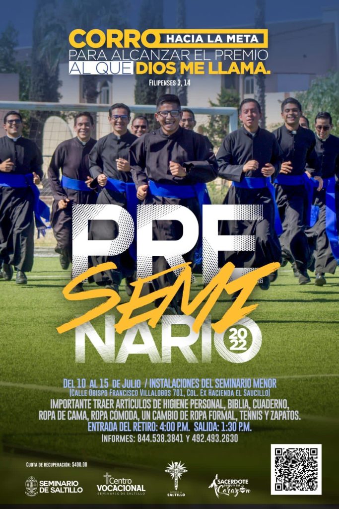 Asimismo, explicó que el costo de participación en este Preseminario es de $400.00 pesos e incluye orientación por parte de religiosos, alimentos, dinámicas de integración y actividades deportivas. Para mayores informes se puede llamar o enviar mensaje al teléfono 844 538 3841 y visitar la página de Facebook “Seminario de Saltillo Centro Vocacional”.