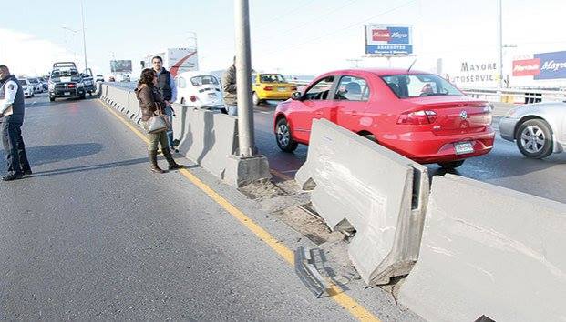Es en bulevares como Nazario Ortiz Garza, Fundadores y puentes a desnivel como los del Periférico Luis Echeverría, donde se separan los carriles con estas barreras de concreto, que ante los percances vehiculares se han ido minando y deteriorando.