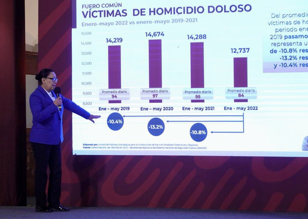 La funcionaria presumió que, de enero a mayo, ha habido un promedio diario de 84 víctimas de homicidio doloso en el país, menor a los registrados en los mismos periodos de 2019, 2020 y 2021.