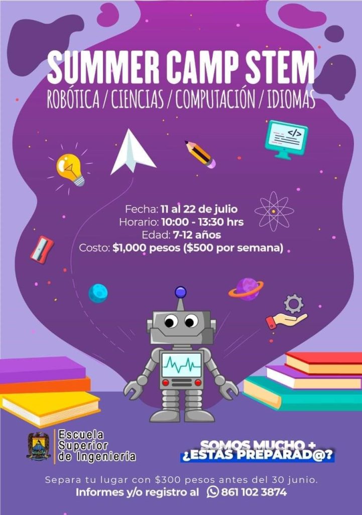 El objetivo de este curso de verano, es que las niñas y niños aprendan a través de actividades llamativas y divertidas, sobre el desarrollo de la ciencia, la robótica, computación e idiomas, que los ayuden a reforzar sus conocimientos e interesarse en la ingeniería y todas sus aplicaciones en el mundo cotidiano; para más información, comunicarse a través de un mensaje de WhatsApp al teléfono (861) 102 3874, o en la página de Facebook Escuela Superior de Ingeniería “Lic. Adolfo López Mateos” UA de C. (EL HERALDO)