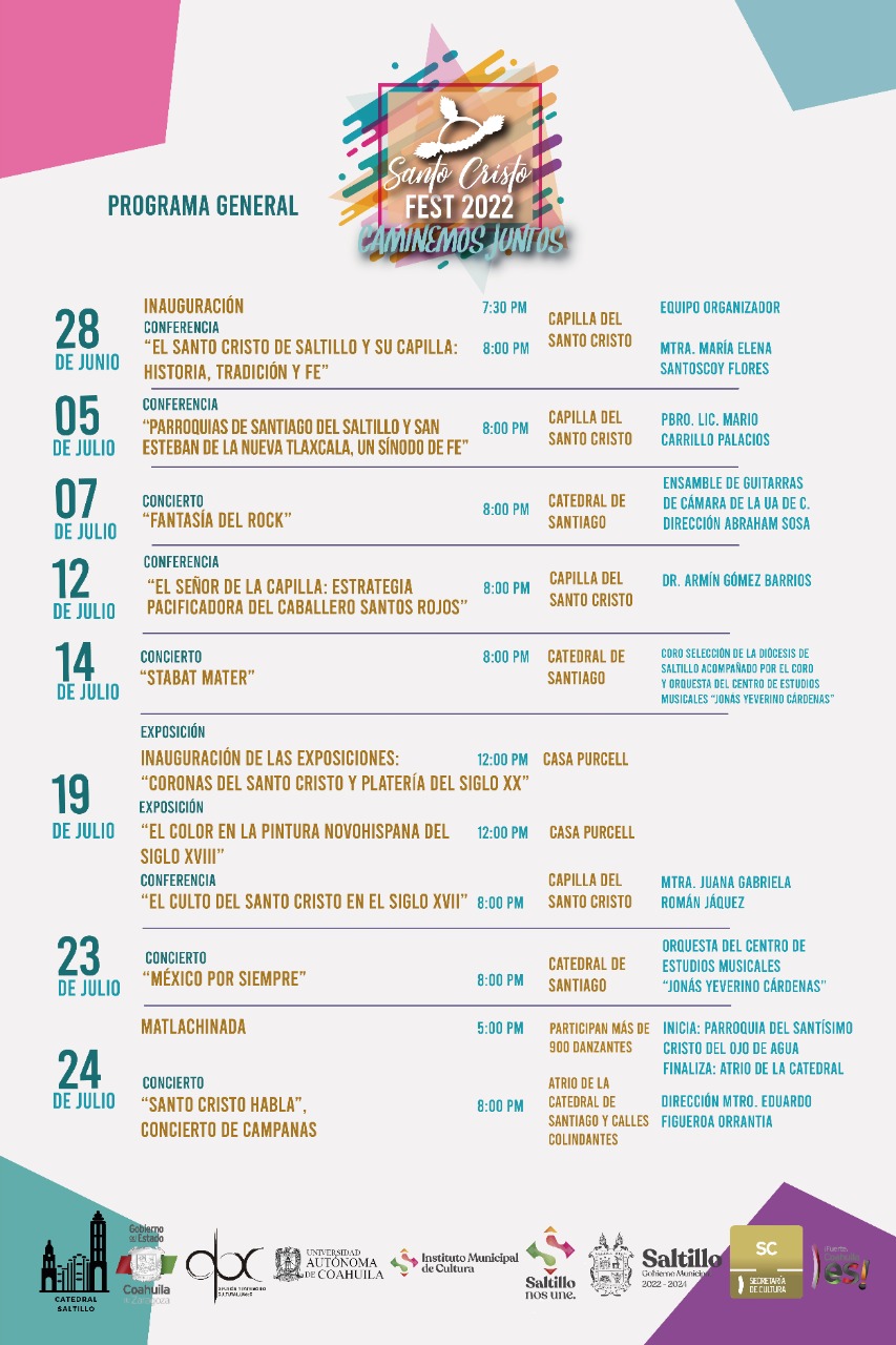El programa está integrado por 4 conferencias, 4 conciertos, 2 exposiciones y la gran Matlachinada Estatal, de acuerdo a la siguiente calendarización: Inicia el 28 de junio, ceremonia de inauguración a las 19:30 horas; posteriormente se realizará la conferencia “El Santo Cristo de Saltillo y su capilla: historia tradición y fe”, a cargo de María Elena Santoscoy Flores, ambos en la Capilla del Santo Cristo.
