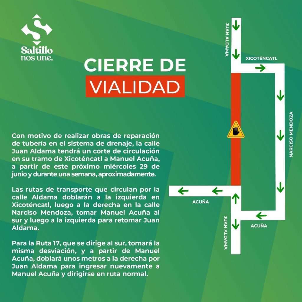Con el fin de realizar obras de reparación de tubería en el sistema de drenaje, la calle Juan Aldama tendrá un corte de circulación en su tramo de Xicoténcatl a Manuel Acuña, a partir de este próximo miércoles 29 de junio y durante una semana, aproximadamente.