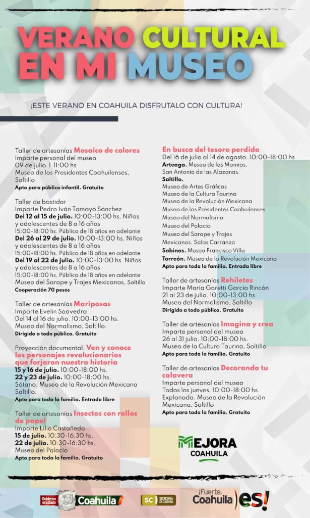 Todas las actividades, horarios y demás se pueden consultar en https://web.facebook.com/CulturaCoahuilaOficial y participar en los diferentes museos del Estado que son: Museo del Palacio, Salas Carranza, Museo del Sarape y Trajes Mexicanos, Museo de la Revolución , Museo de los Presidentes Coahuilenses, Museo del Normalismo, Museo de Artes Gráficas y Museo de la Cultura Taurina, en Saltillo.