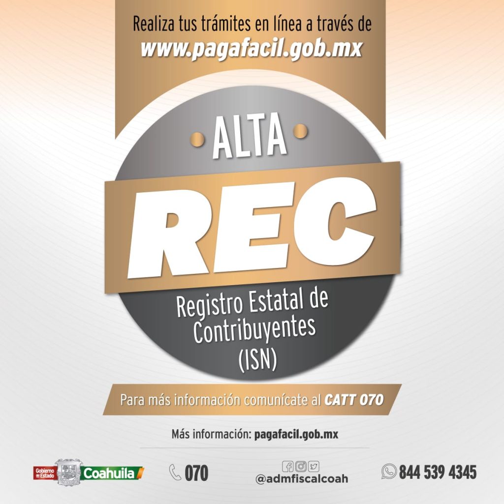 “Las personas físicas y morales que generan empleos dentro del Estado de Coahuila están sujetos a registrarse en el REC para realizar sus declaraciones de Impuestos Sobre Nómina (ISN)”, explicó el Administrador Fiscal.