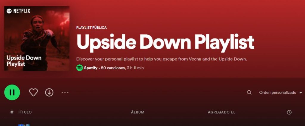 La aplicación de Spotify recopila una serie de 50 canciones de acuerdo con tus gustos musicales y te muestra una playlist con el nombre de «Upside Down Playlist» la cual puedes compartir con tus amigos.