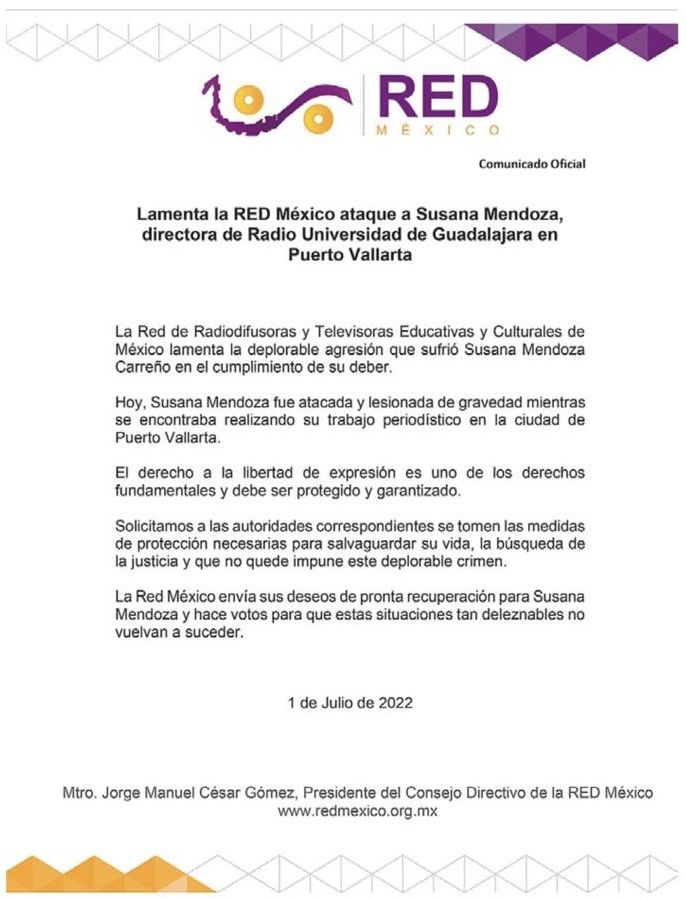 El presidente del Consejo Directivo de la Red de Radiodifusoras y Televisoras Educativas y Culturales de México, Jorge Manuel César Gómez condenó el atentado contra la vida de Susana Mendoza Carreño, directora de la Radio Universidad de Guadalajara y colaboradora de canal 44 en Puerto Vallarta.