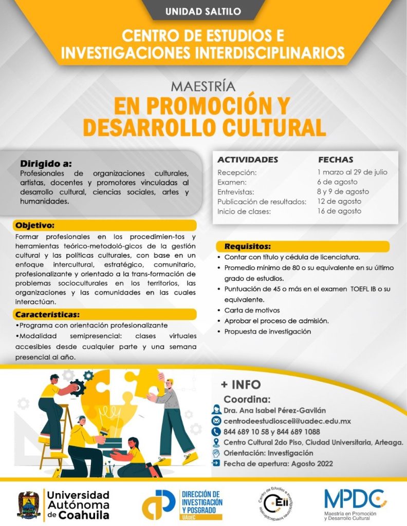 El Centro de Estudios e Investigaciones Interdisciplinarias Unidad Saltillo de la Universidad Autónoma de Coahuila, extendió al 29 de julio la fecha de registro para los aspirantes interesados en cursar la Maestría en Promoción y Desarrollo Cultural, que dará inició el 16 de agosto en un formato semipresencial o híbrido.