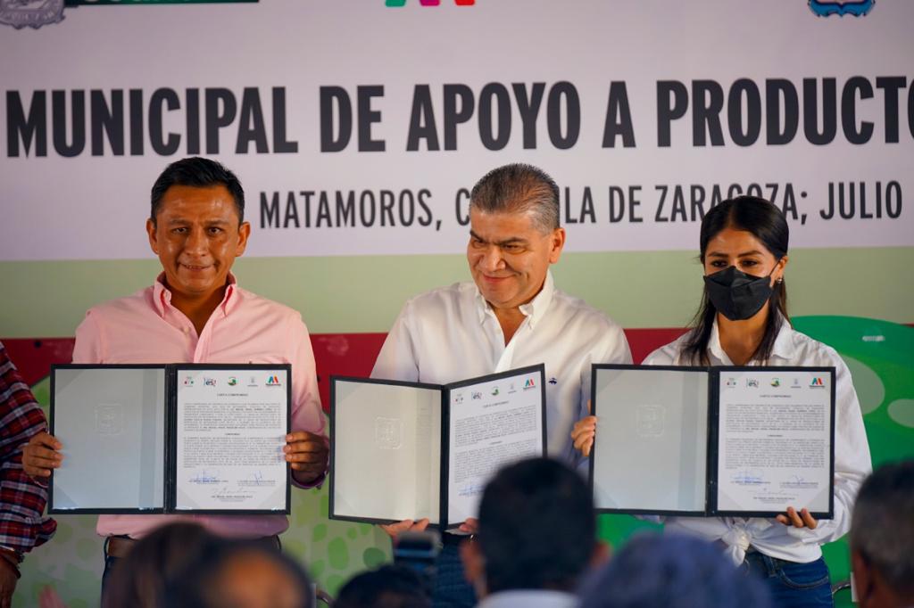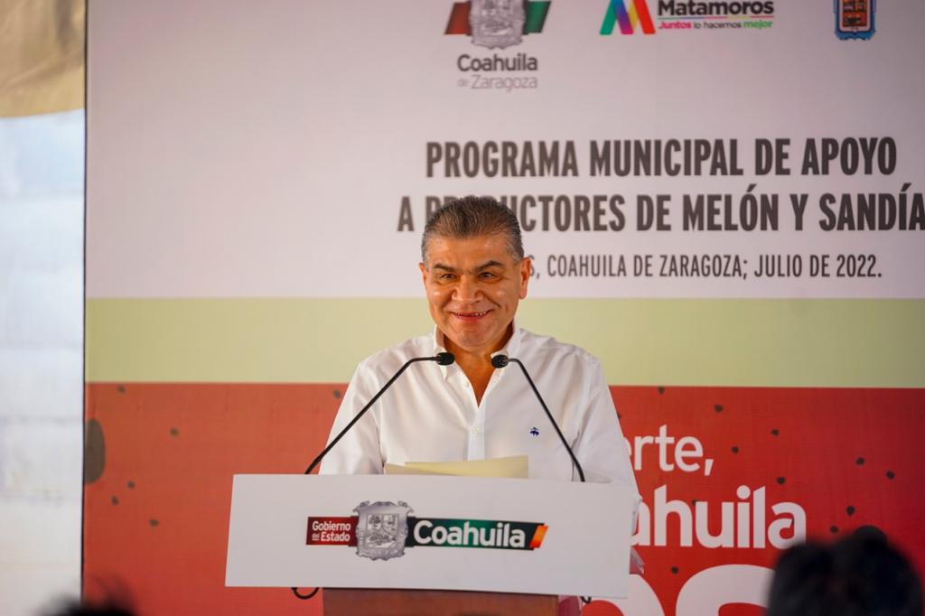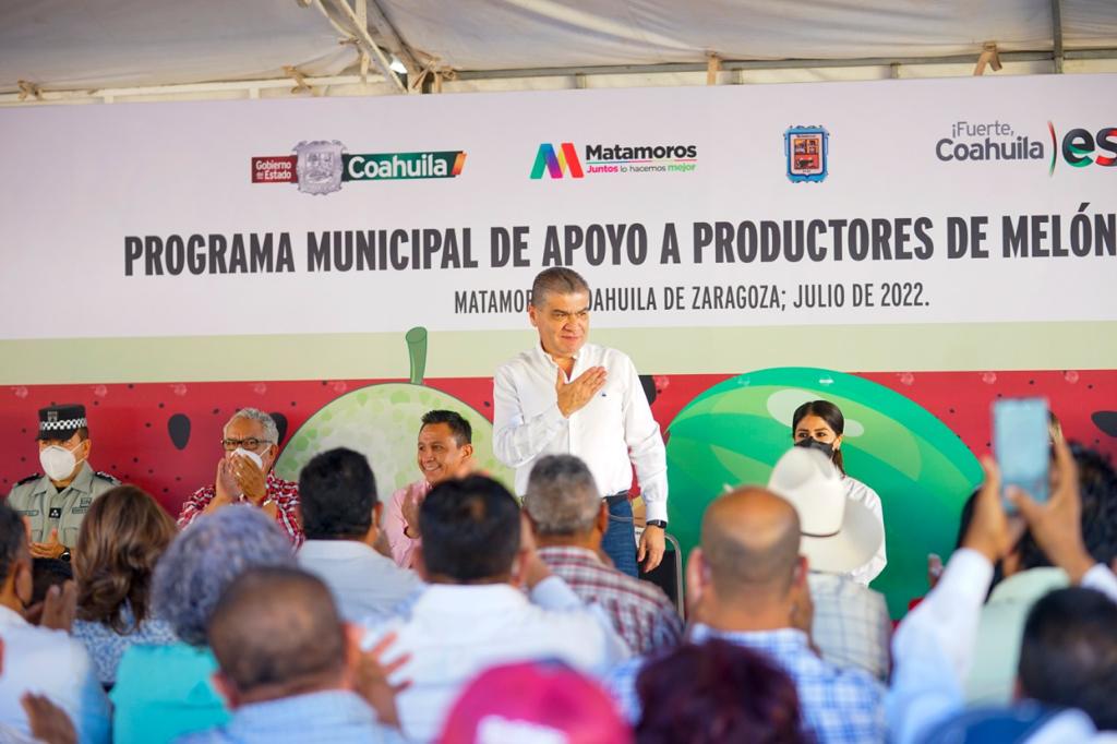 Matamoros.- El gobernador Miguel Ángel Riquelme Solís encabezó el arranque del Programa Municipal de Apoyo a Productores de Melón y Sandía, con el que se beneficia a 273 productores de este municipio, con una inversión de un millón 365 mil pesos.