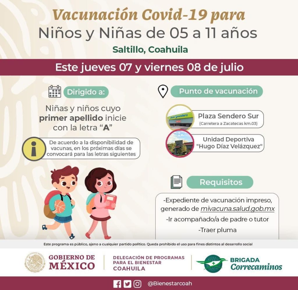 En sus primeras fechas, el proceso de inoculación se desarrollará este jueves 07 y viernes 08 de julio en el Centro Comercial Plaza Sendero Sur de la capital coahuilense y en la Unidad Deportiva “Hugo Díaz Velázquez” de Ramos Arizpe, y será exclusivo para infantes cuyo primer apellido inicie con la letra A.
