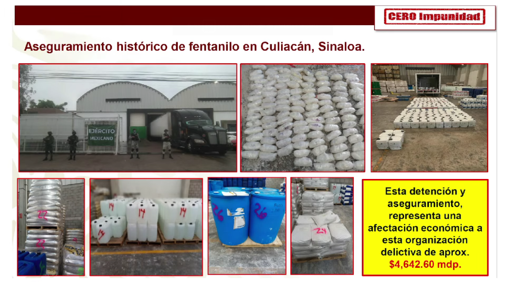 Durante el aseguramiento de los individuos, personal del Ejército Mexicano observó que en el interior del inmueble se encontraban diversos paquetes de plástico de fentanilo, con un peso histórico de 542.72 kilogramos, considerado el más grande que se ha registrado en nuestro país.