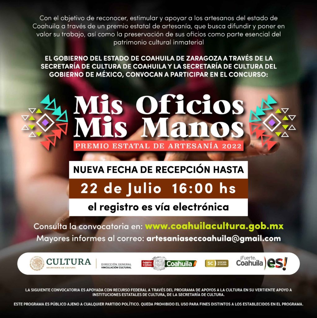 La Secretaría de Cultura de Coahuila (SC) informa de la ampliación de dos importantes convocatorias: el Premio Estatal de Artesanía “Mis oficios, mis manos” y de “Proyectos Cinematográficos en Corto”, mismas que amplían su plazo hasta el viernes 22 de julio del año en curso a las 16:00 horas, recordando que el registro es vía electrónica.