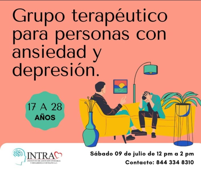 Para brindar acompañamiento y atención oportuna a jóvenes que sufren de ansiedad y depresión, el Instituto de Atención y Desarrollo Humano (Intra) Asociación Civil creó un grupo de apoyo que tendrá su primera sesión este sábado, de 12:00 del mediodía a 2:00 de la tarde, en las instalaciones de Intra, ubicadas en Candela 2162, colonia República Poniente de Saltillo.