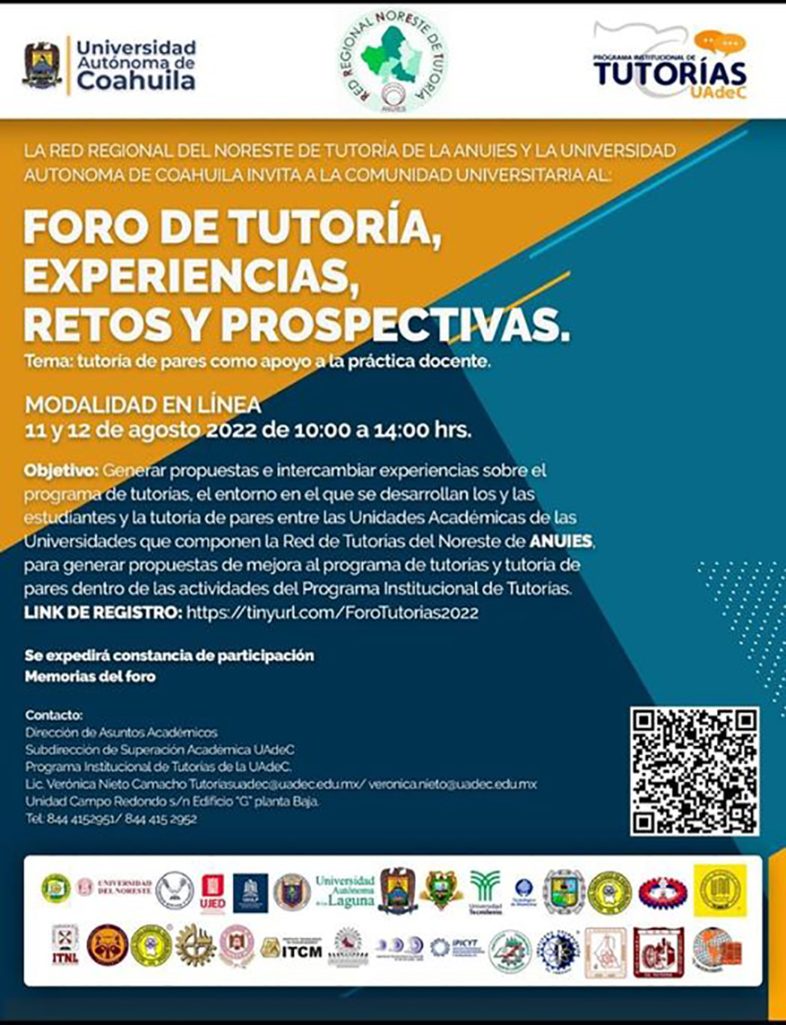 La Universidad Autónoma de Coahuila convoca a la comunidad universitaria a asistir al Foro de Tutorías, Experiencias, Retos y Prospectivas, en el que se hablará de las tutorías de pares como apoyo a la práctica docente, organizado por la Red Regional Noreste de la Asociación Nacional de Universidades e Instituciones de Educación Superior, que se realizará en modalidad virtual los días 11 y 12 de agosto de 2022.