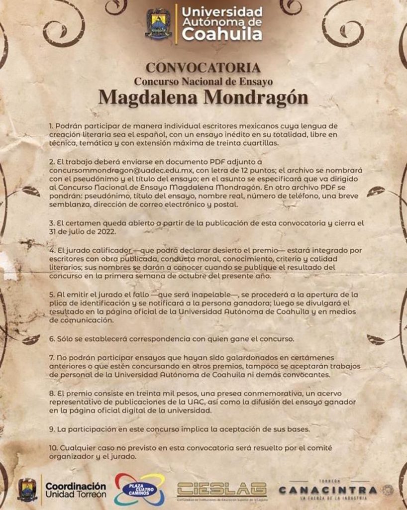 La Universidad Autónoma de Coahuila a través de la Coordinación de Unidad Torreón en conjunto con Plaza Cuatro Caminos, CIESLAG y Canacintra Torreón, convocan al Concurso Nacional de Ensayo “Magdalena Mondragón”, en el cual podrán participar de manera individual escritores mexicanos cuya lengua de creación literaria sea el español, con un ensayo inédito en su totalidad, libre en técnica, temática y con extensión máxima de treinta cuartillas.