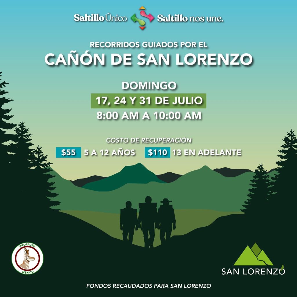 La Asociación Civil Conservación San Lorenzo, en conjunto con la Oficina Saltillo de Protección de la Fauna Mexicana (Profauna), realizará recorridos guiados por el Cañón de San Lorenzo los días 17, 24 y 31 de julio, de 8:00 a 10:00 de la mañana.