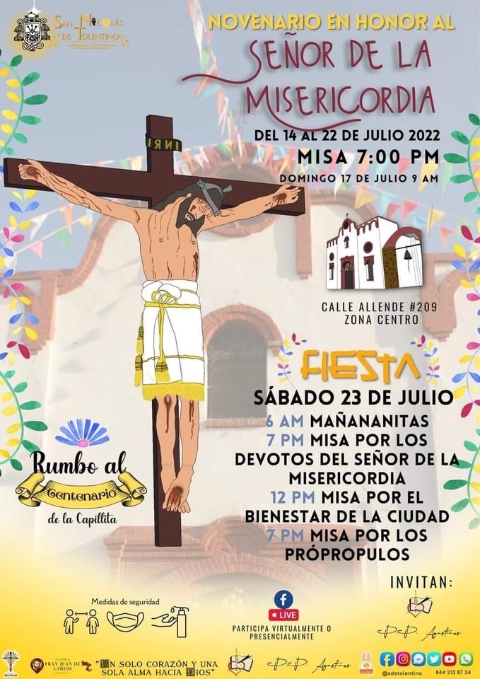 La actividad inicia este jueves con el novenario en honor al Señor de la Misericordia a efectuarse del 14 al 22 de julio con la celebración de misas en punto de las 19:00 horas cada día a excepción de el domingo 22 de julio, día en que la eucaristía se celerará a las 9:00 horas.