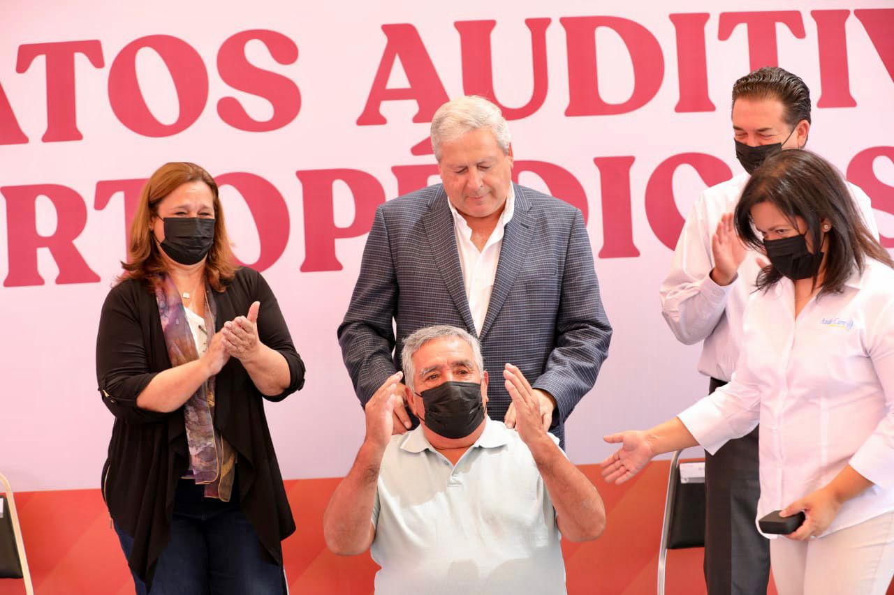 El alcalde José María Fraustro Siller, acompañado por la señora Beatriz Dávila de Fraustro, presidenta honoraria de DIF Saltillo, así como de Herminio Rodríguez Torres, director del CRIT Coahuila y Jaime Bueno Zertuche, diputado federal, entregó 75 aparatos auditivos, además de 23 aparatos ortopédicos a personas en estado de vulnerabilidad.