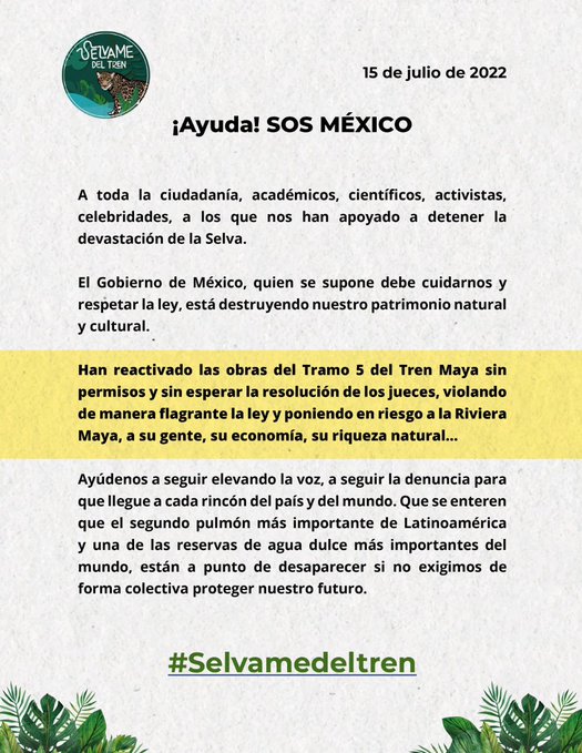 Han reactivado las obras del Tramo 5 del Tren Maya sin permisos y sin esperar la resolución de los jueces, violando de manera flagrante la ley y poniendo en riesgo a la Riviera Maya, a su gente, su economía, su riqueza natural…