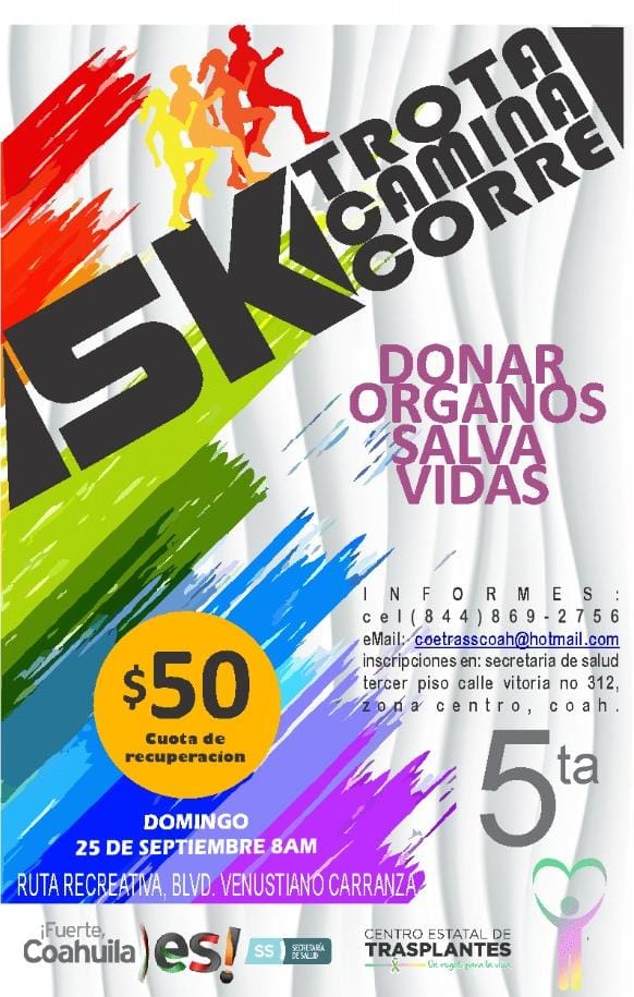 El Centro Estatal de Trasplantes de Coahuila (COETRA) dio a conocer que el próximo 25 de septiembre se llevará a cabo nuevamente en Saltillo, después de dos años de suspensión debido a la pandemia del COVID-19, la carrera atlética 15 K “Donar órganos salva vidas”, camina, trota o corre, a través de la cual, se buscará concientizar a la población sobre la donación altruista de órganos, procedimiento que en la entidad registra números sumamente bajos.