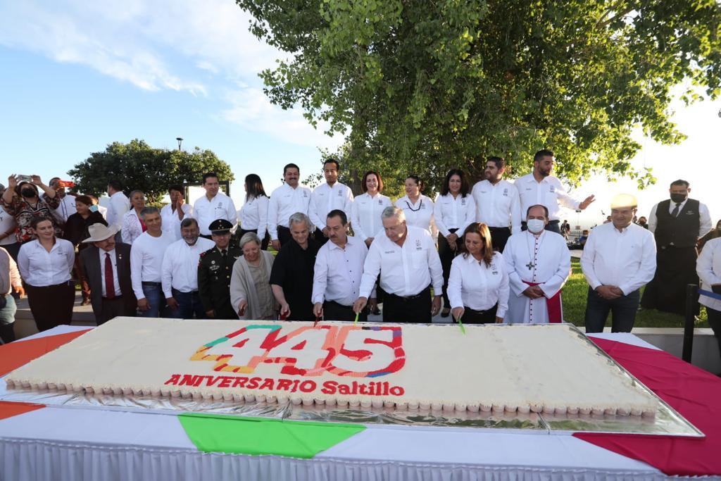 Unidos, sociedad y autoridades, celebraron el 445 Aniversario de la fundación de Saltillo a través de un magno festejo en el que se cantaron Las Mañanitas, se colocó la tradicional Ofrenda Floral en la Parroquia del Santísimo Cristo del Ojo de Agua y se montó la Guardia de Honor en la Plaza de la Nueva Tlaxcala.