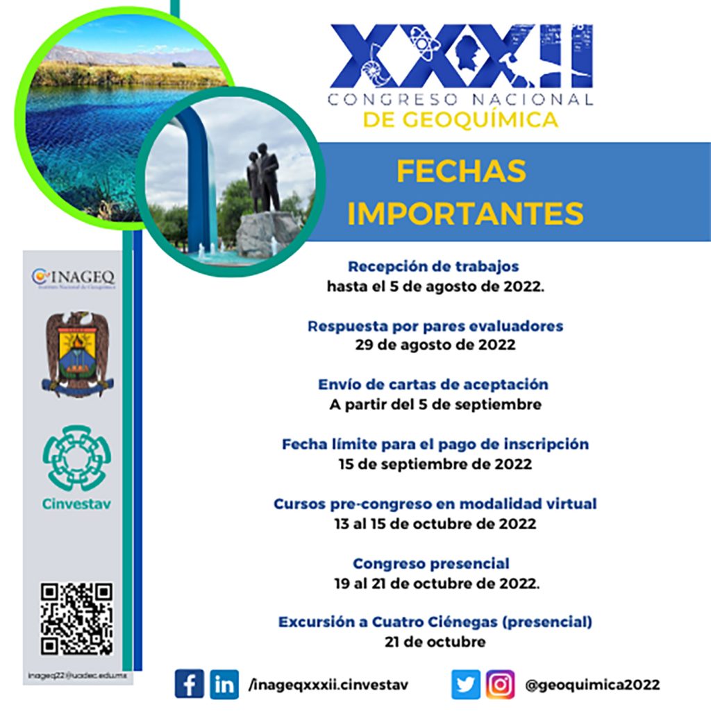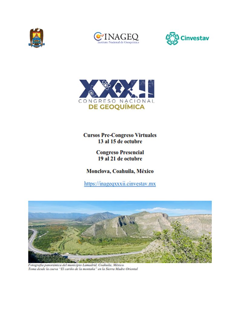 La Universidad Autónoma de Coahuila en colaboración con el Instituto Nacional de Geoquímica A.C. (INAGEQ) y el CINVESTAV Unidad Saltillo, invitan a la comunidad de investigación en ciencias de la tierra y ciencias afines a la química de los sistemas terrestres, a participar en el XXXII Congreso Nacional de Geoquímica-INAGEQ 2022, que se llevará a cabo del 13 al 15 de octubre de 2022 para los cursos pre-congreso en modalidad virtual por Microsoft Teams y del 19 al 21 de octubre de 2022 de forma presencial en la Sala de Seminarios de la Unidad Norte de la UAdeC en la ciudad de Monclova, Coahuila.