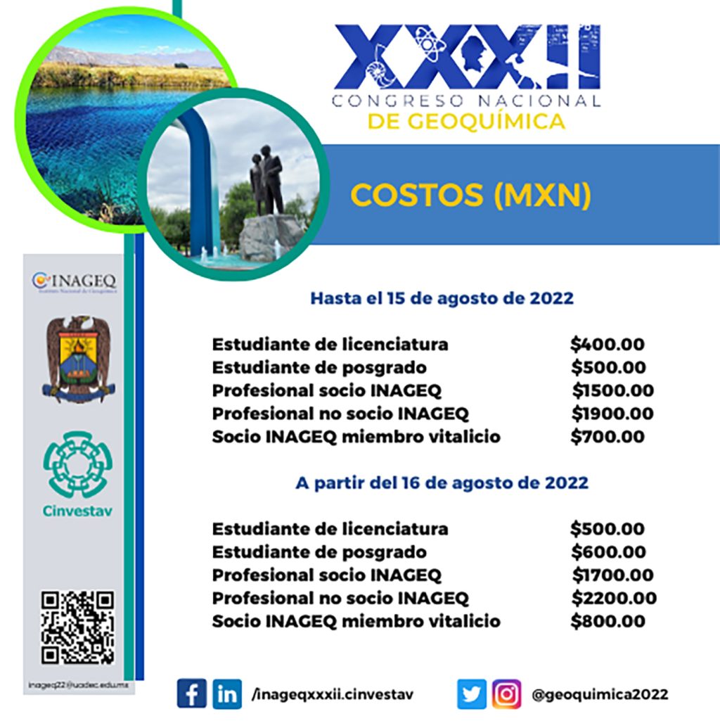 Los interesados en participar en el congreso en presentación oral o póster deberán de cubrir una cuota, la cual incluye la asistencia a uno de los cursos pre-congreso, hasta el 15 de agosto de 2022, los costos son: $400.00 estudiante de licenciatura como asistente, $500.00 estudiante de posgrado como asistente $1,500.00 profesional socio como asistente, $1,900.00 profesional no socio como asistente y $700.00 socio INAGEQ Miembro Vitalicio como asistente.