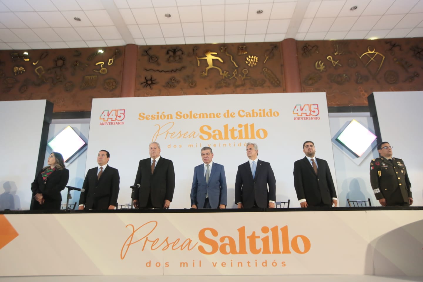 El gobernador Miguel Ángel Riquelme Solís acompañó al presidente municipal, José María Fraustro Siller, así como a todo su Cabildo, en la Sesión Solemne con la que se conmemoró el 445 Aniversario de Saltillo